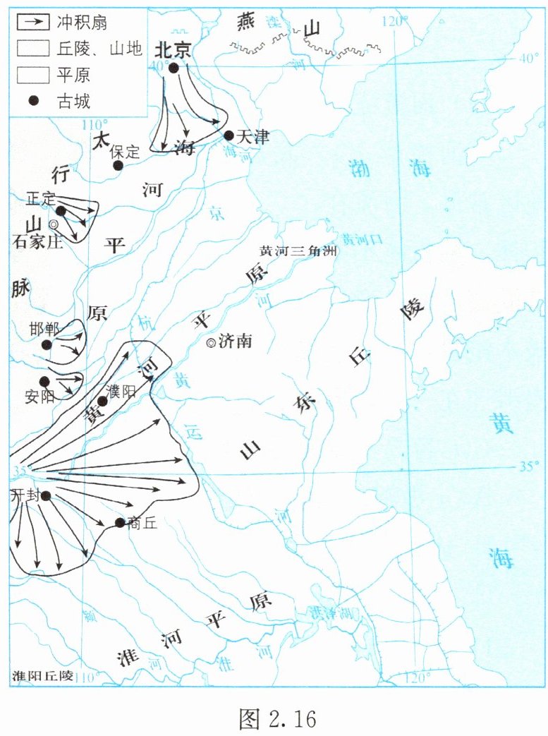 图2.16示意华北平原主要冲积扇分布。读图并完成下列要求。