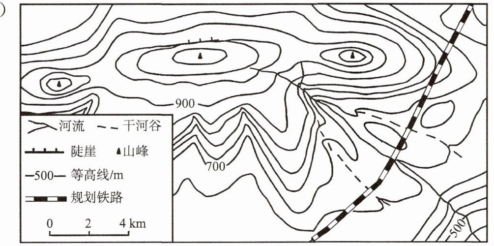 本题考查课程标准中“结合实例,解释内力和外力对地表形态变化的影响,并说明人类活动与地表形态的关系”这一内容要求。本题以某地地形及规划铁路位置示意图为材料,涉及等高线地形图的判读、河流冲积地貌以及交通运输线区位因素的相关知识,考查学生读图获取信息以及运用已学知识分析并解决问题的能力。
