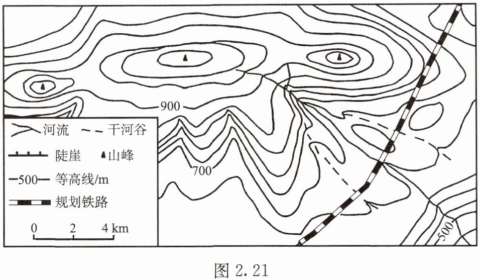 (2023·江苏卷)某地规划的铁路穿过一冲积扇。图2.21为某地地形及规划铁路位置示意图。据此完成下列要求。
