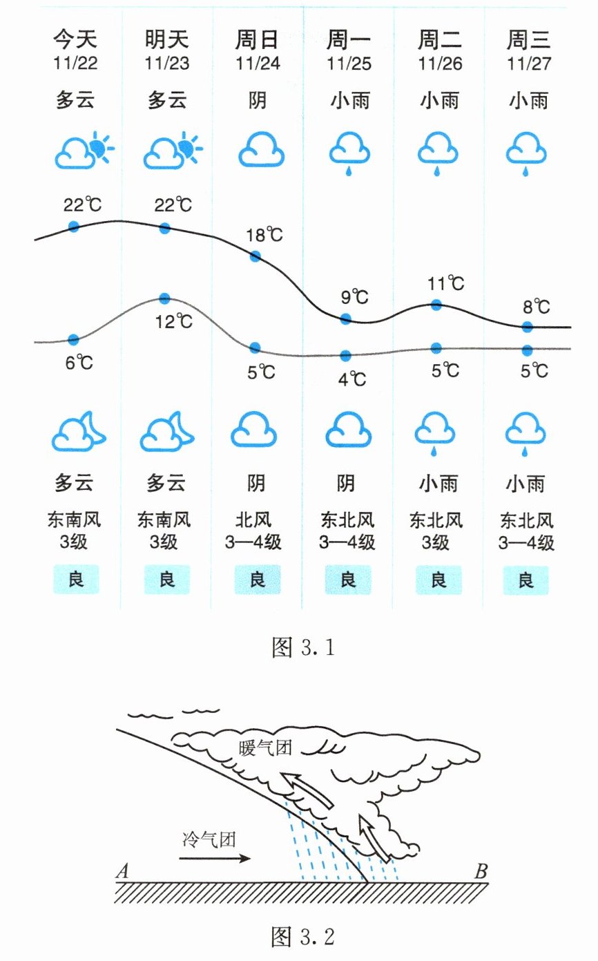 (2)读图可知,图3.2表示的是冷锋,该锋面的移动方向是由冷气团向暖气团移动,该锋面形成的降水往往降落在锋后,一般降水时间较短。读图可知,合肥市11月22日气温较高,未来几天内将会大幅降温,所以可推断11月22日受暖气团控制,位于B地。