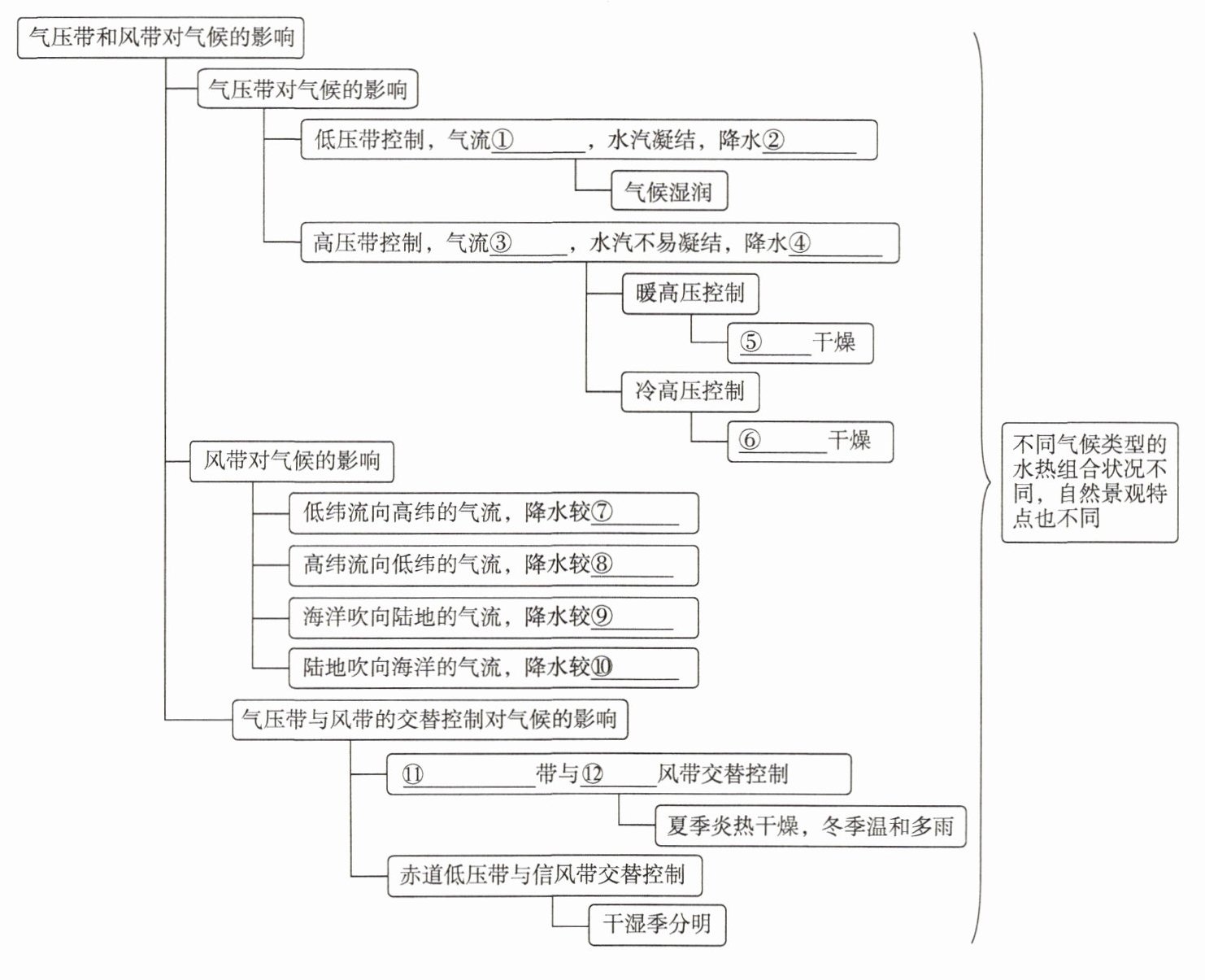 ①上升 ②丰富 ③下沉 ④稀少 ⑤炎热 ⑥寒冷 ⑦多 ⑧少 ⑨多 ⑩少 ⑪副热带高压 ⑫西