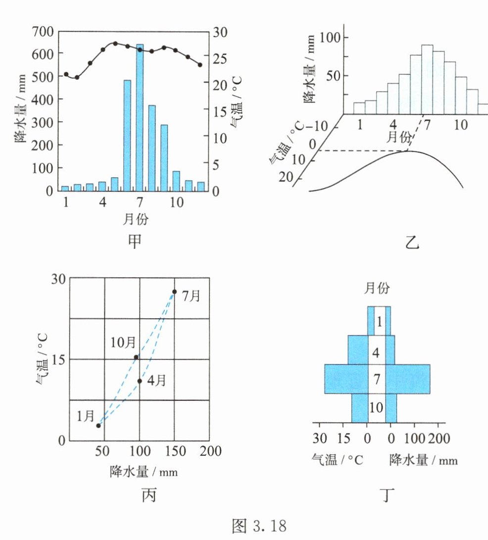 读图3.18中四地气温和降水资料示意图,完成下列要求。