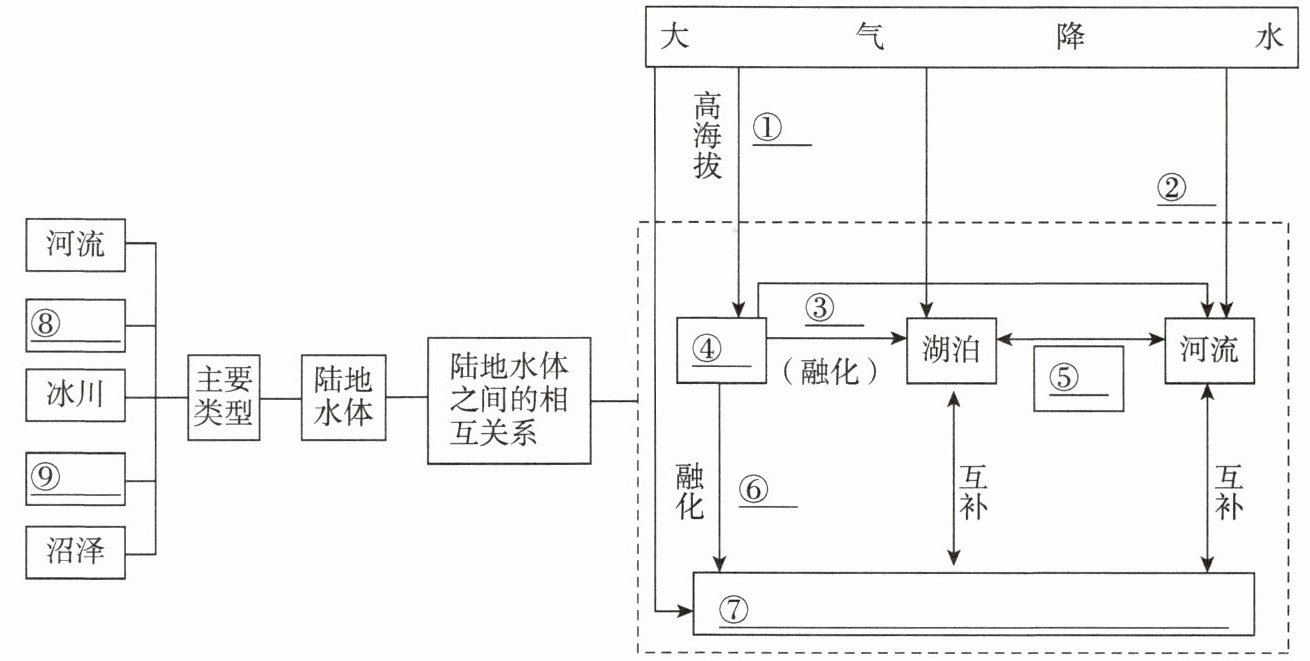知识梳理 ①高纬度 ②降水量 ③气温 ④冰川 ⑤互补 ⑥下渗 ⑦地下水 ⑧湖泊 ⑨地下水(⑧⑨可互换)