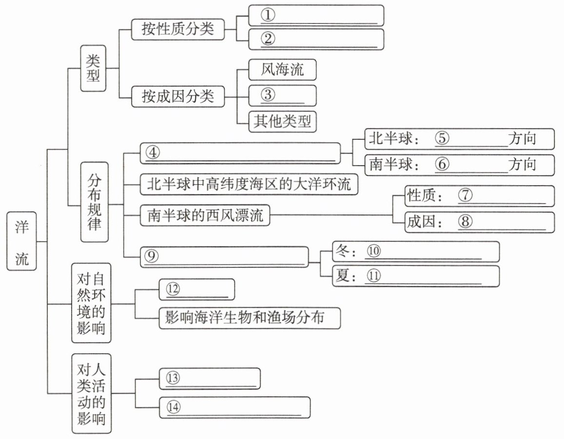 知识梳理 ①寒流 ②暖流 ③补偿流 ④中低纬度海区的大洋环流 ⑤顺时针 ⑥逆时针 ⑦寒流 ⑧海洋面积广(没有陆地阻挡) ⑨北印度洋的季风洋流 ⑩逆时针 ⑪顺时针 ⑫影响气候 ⑬影响航行 ⑭影响海洋污染物的扩散