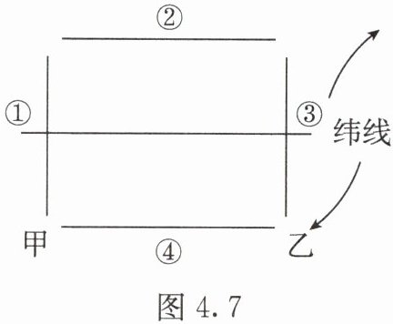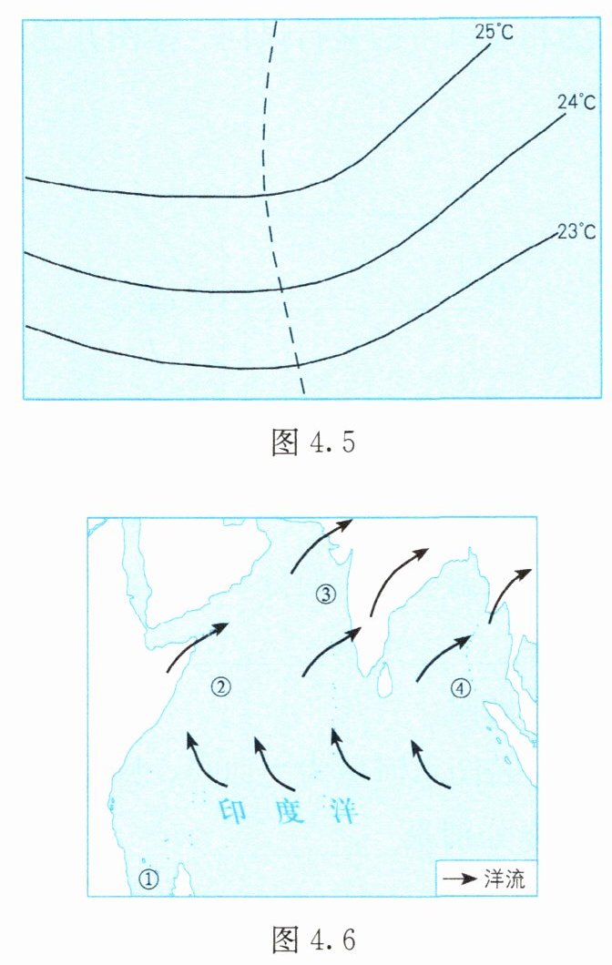 (2) 图4.5虚线所示的洋流朝______(方向)流动。在图4.6所示的①②③④四海区中,图4.5表示的海域可能出现在______海区。