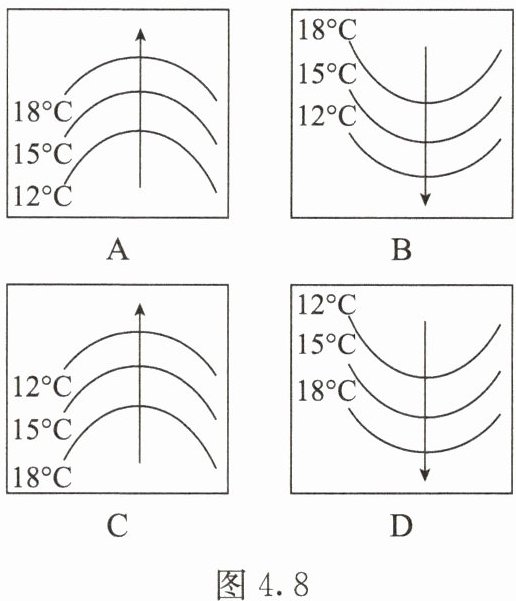 (4)流经③处的洋流地处北半球,流向是从高纬度向低纬度流,从北向南流,即从温度低的海区向温度高的海区流,结合所学知识可知,图4.8中D图符合条件。A、B图为南半球,C图为暖流,均不符合条件。故本题正确答案为D。