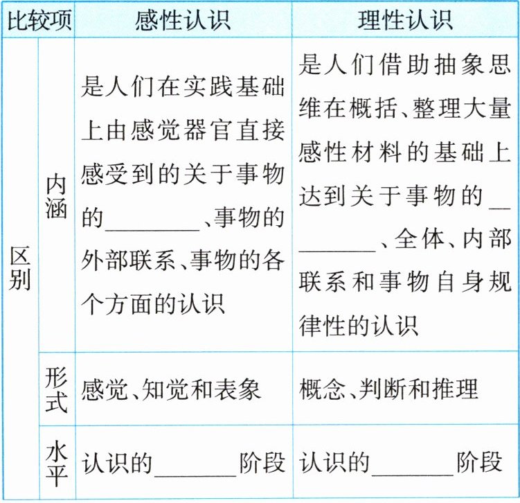 (2) 形式:感性认识和理性认识是人们对客观世界的两种不同水平的反映形式,也是认识过程的两个不同阶段。