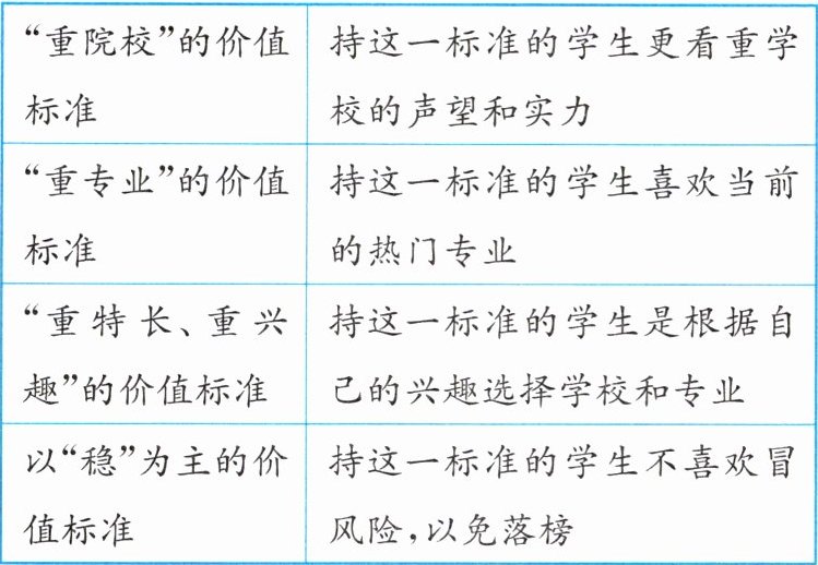 ②不同的志愿选择各有利弊,只要符合自己的情况,有利于人生价值的实现,都是可取的。同时,应注意不能离开社会需要,不顾自身条件,盲目追求学校声望和实力以及所谓“热门”专业。