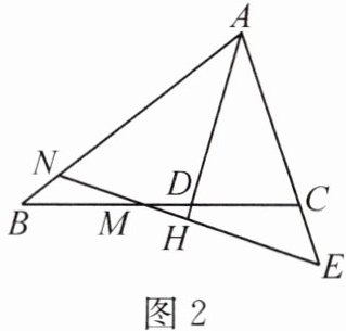 (2)如图2,若点M为线段BD上的点,过点M作直线$MH\perp AD$交AD的延长线于点H,分别交直线AB、AC于点N、E.