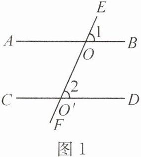 已知:如图 1,直线 $ AB // CD $,直线 $ EF $ 分别与 $ AB $、$ CD $ 交于点 $ O $、$ O' $。