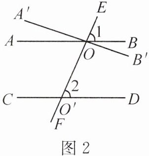 如图 2,过点 $ O $ 作直线 $ A'B' $,使 $ \angle EOB' = \angle 2 $。