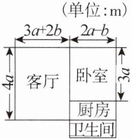 例 3 小明家新买了一套商品房,户型结构如图,小明的爸爸打算把除卫生间外的地面都铺上地板,请你帮小明算一算,至少需要买多少平方米的地板?