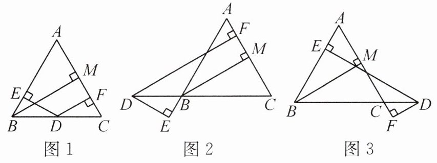 (2)如图 2、图 3,当点 D 在 CB 的延长线上或者在 BC 的延长线上时,问题(1)中 DE、DF、BM 三线段之间的数量关系是否还成立?若成立,请选择一个图形进行证明;若不成立,请在图 2 或图 3 中选择一个图形,写出三线段之间的数量关系,并进行证明。