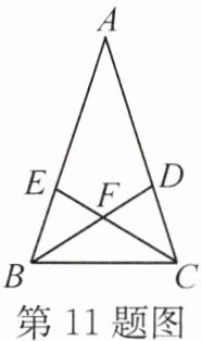 11. 如图,在 $ \triangle ABC $ 中,$ \angle ABC = \angle ACB = 72^{\circ} $,$ BD $、$ CE $ 分别是 $ \angle ABC $ 和 $ \angle ACB $ 的平分线,它们的交点为 $ F $,则图中共有