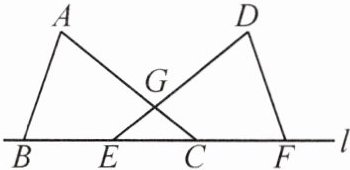 13. (14 分)[2024·常州]如图,点 $ B $、$ E $、$ C $、$ F $ 是直线 $ l $ 上的四点,$ AC $、$ DE $ 相交于点 $ G $,$ AB = DF $,$ AC = DE $,$ BC = EF $. 求证:$ \triangle GEC $ 是等腰三角形.
