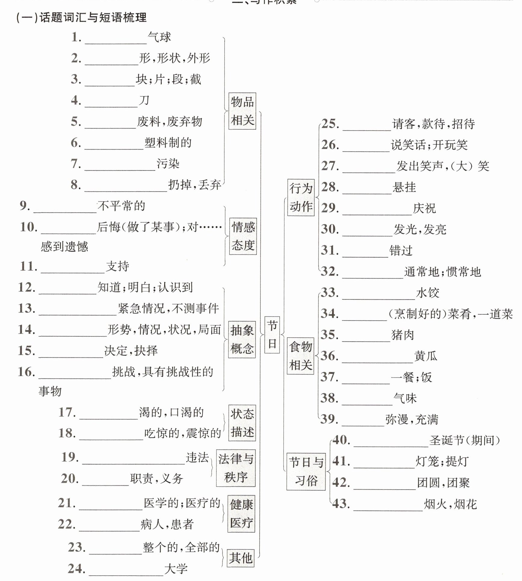 1.balloon 2.shape 3.piece 4.knife 5.waste 6.plastic 7.pollution 8.throw away 9.unusual 10.regret 11.support 12.realise 13.emergency 14.situation 15.decision 16.challenge 17.thirsty 18.shocked 19.against the law 20.duty 21.medical 22.patient 23.whole 24.university 25.treat 26.joke 27.laugh 28.hang 29.celebrate 30.shine 31.miss 32.usually 33.dumpling 34.dish 35.pork 36.cucumber 37.meal 38.smell 39.fill 40.Christmas 41.lantern 42.reunion 43.firework
