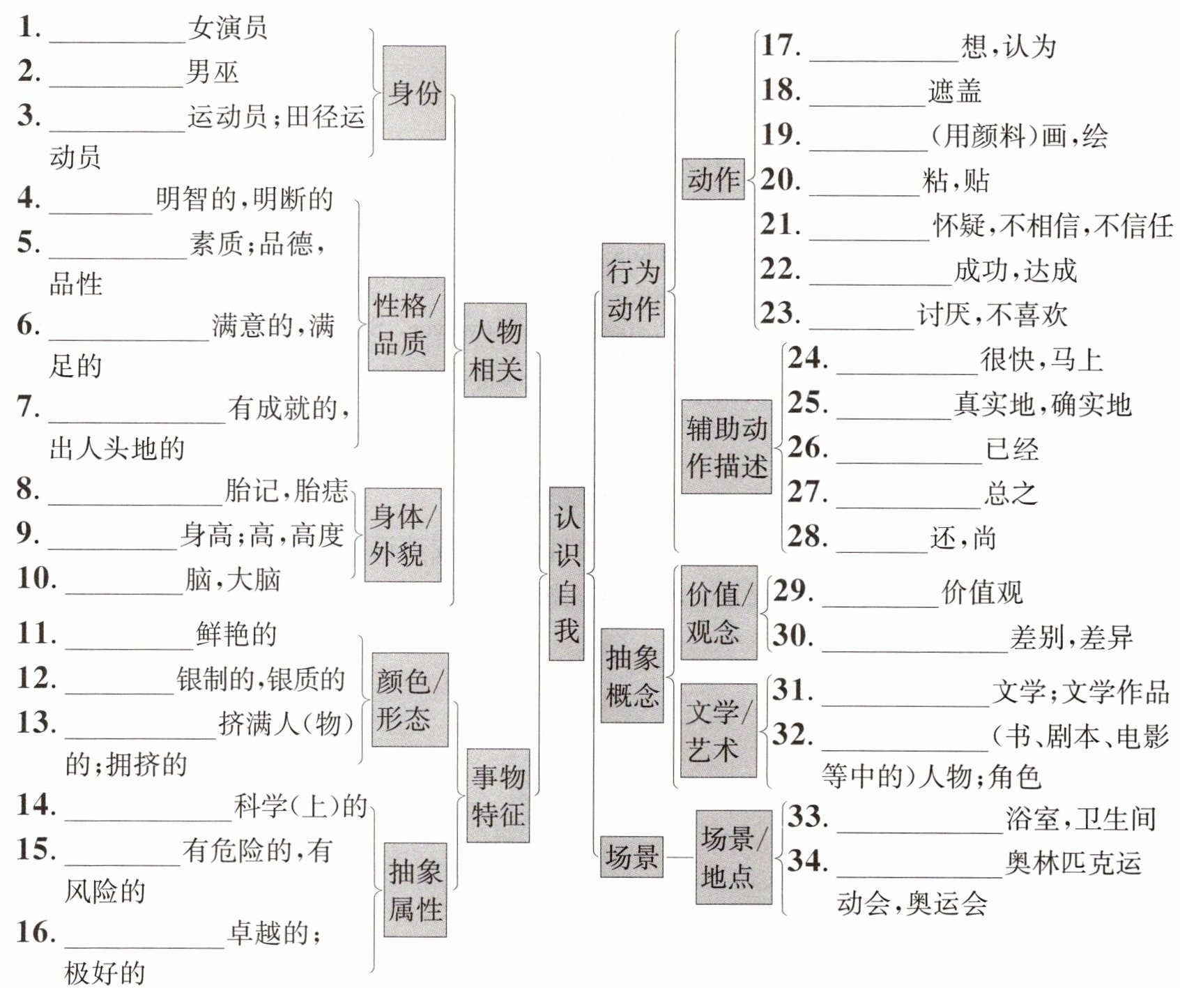 1.actress 2.wizard 3.athlete 4.wise 5.quality 6.satisfied 7.successful 8.birthmark 9.height 10.brain 11.bright 12.silver 13.crowded 14.scientific 15.risky 16.excellent 17.suppose 18.cover 19.paint 20.stick 21.doubt 22.succeed 23.hate 24.quickly 25.truly 26.already 27.anyway 28.yet 29.value 30.difference 31.literature 32.character 33.bathroom 34.Olympics