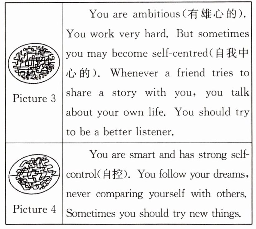 (find) your advantage(优点)yet.”This term, something changed. In art class, we had a drawing competition. I spent weeks practising, and when the results came out, I won first place! My teacher said, “You 3.