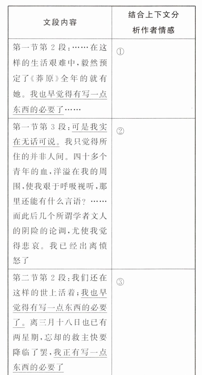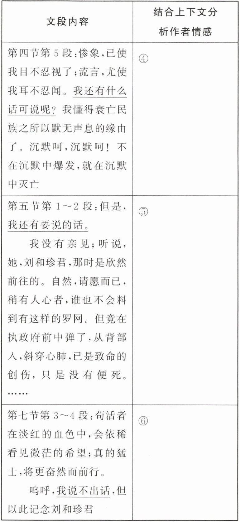 2.①表现出作者对刘和珍这样的进步青年的爱护 ②反动派制造流血惨案、流言家在惨案后制造“阴险的论调”,给作者带来的哀痛和愤怒,已经难以用语言来表达了 ③作者觉得有必要撰文纪念烈士,以抗拒遗忘,警醒“庸人”,表达了作者的痛苦感和责任感 ④面对惨案过后的沉默无声的社会现实,作者发出这样的感慨,表达作者的愤懑之情 ⑤紧接着前文“我还有什么话可说呢”,作者还是忍不住说话揭露事实真相。由不说到说,表达了作者揭露黑暗、记录历史的勇气和责任感 ⑥作者觉得还有许多话要说,但由于现实太过黑暗,内心太过压抑,说不出来了