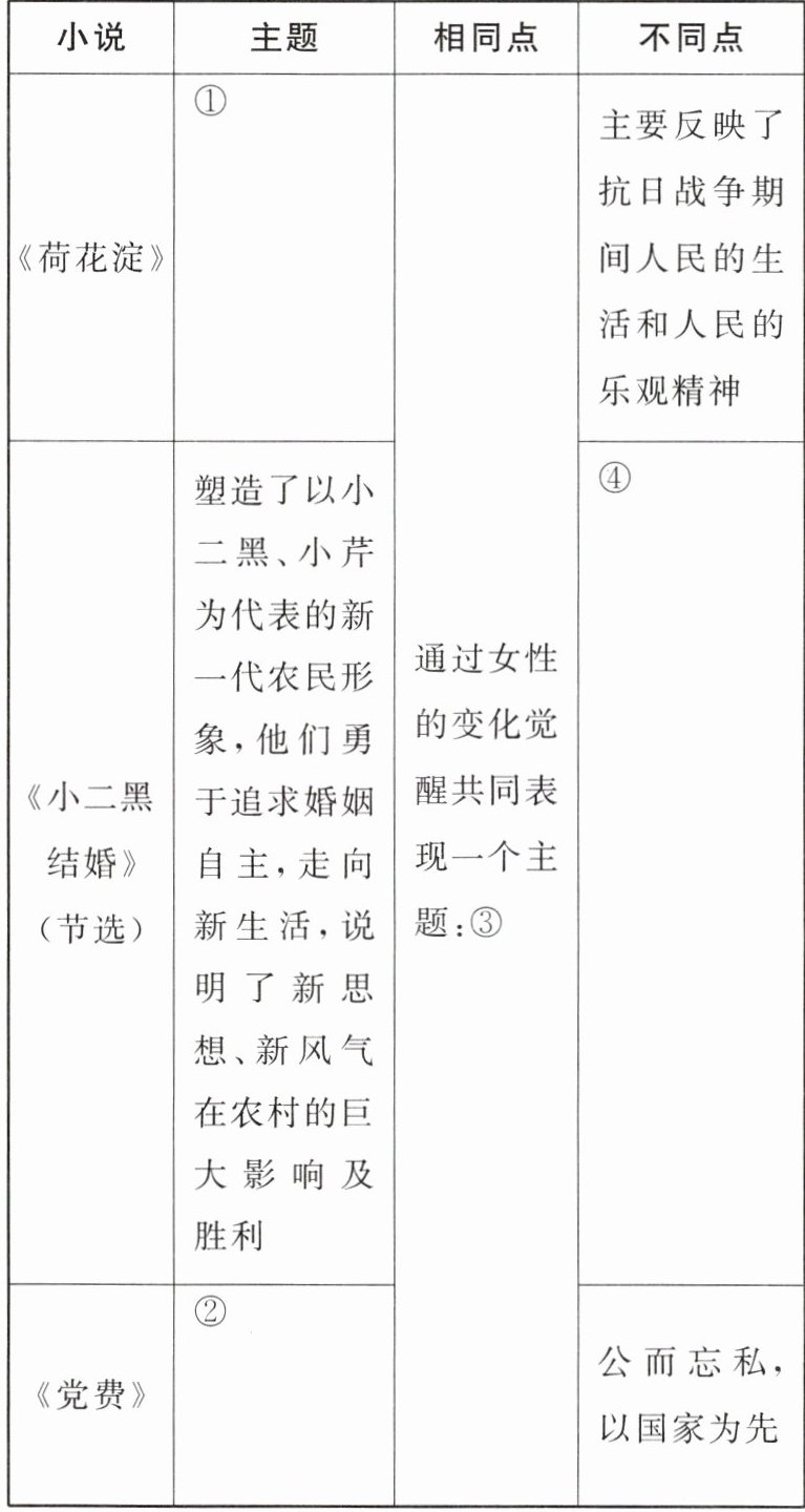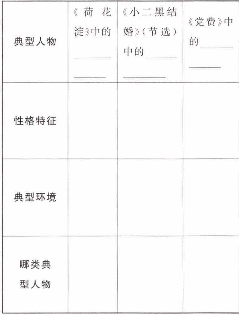 3. 假如让你为《小说月刊》“新生”栏目写一篇关于水生嫂、小二黑和小芹及黄新形象比较的论文,你能通过写作手法分析出他们的形象特点吗?他们之间有没有什么共性?比较《荷花淀》、《小二黑结婚》(节选)、《党费》中的典型人物,填写下面的表格。