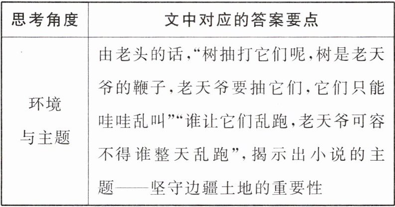2. ①交代背景,写环境的恶劣,突出守护边疆荒漠土地的艰难。②衬托人物,用环境的恶劣衬托主人公守护土地的顽强精神。③暗示主题,通过写整天乱跑的风“挨打”,揭示坚守边疆土地的重要性。