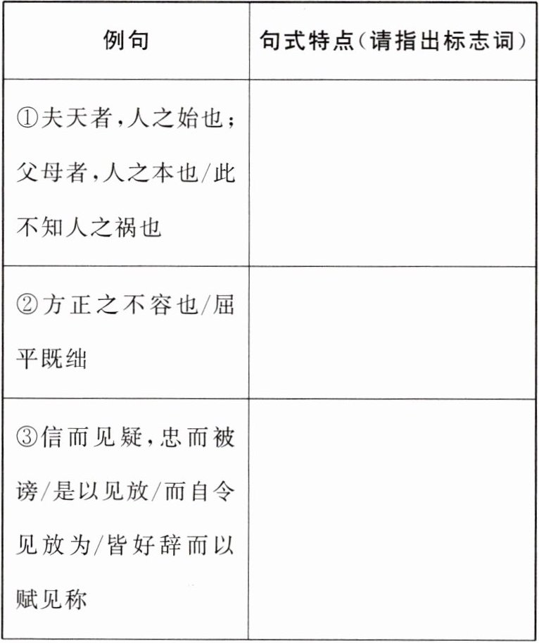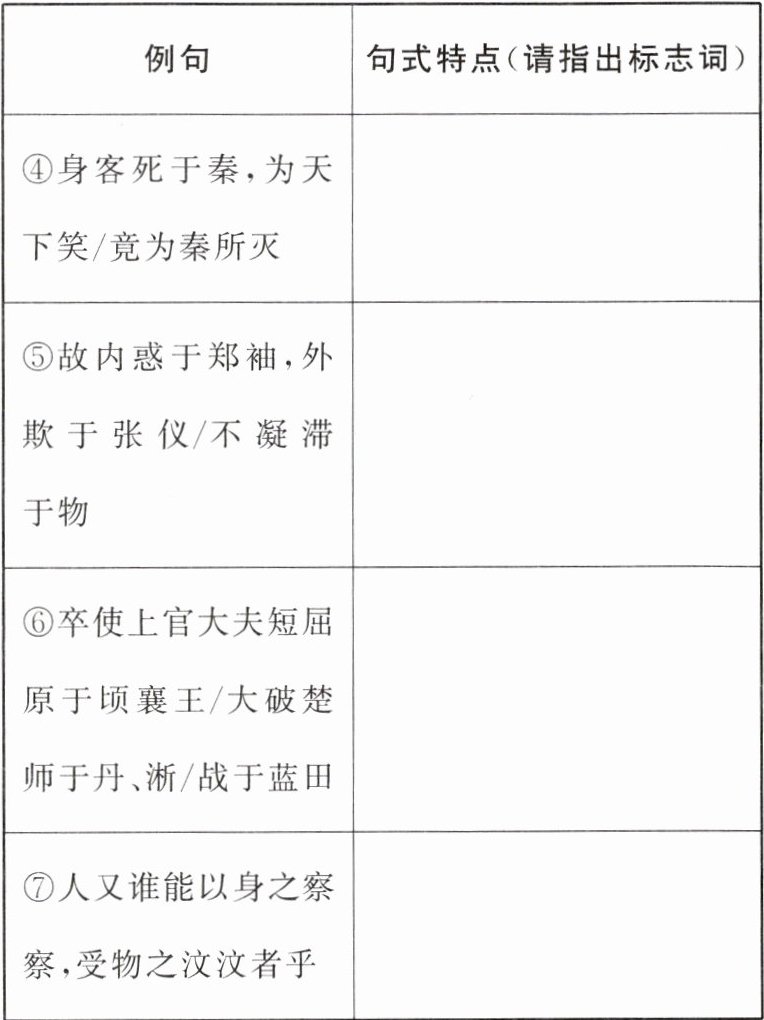 4.①判断句,“……者,……也”“……也”表判断 ②被动句,没有标志 ③被动句,“见”为被动句标志 ④被动句,“为”“为……所……”为被动句标志 ⑤被动句,“于”为被动句标志 ⑥介词短语后置句,“于”为语言标志 ⑦定语后置句,“身之察察”“物之汶汶”的正常语序为“察察之身”“汶汶之物”