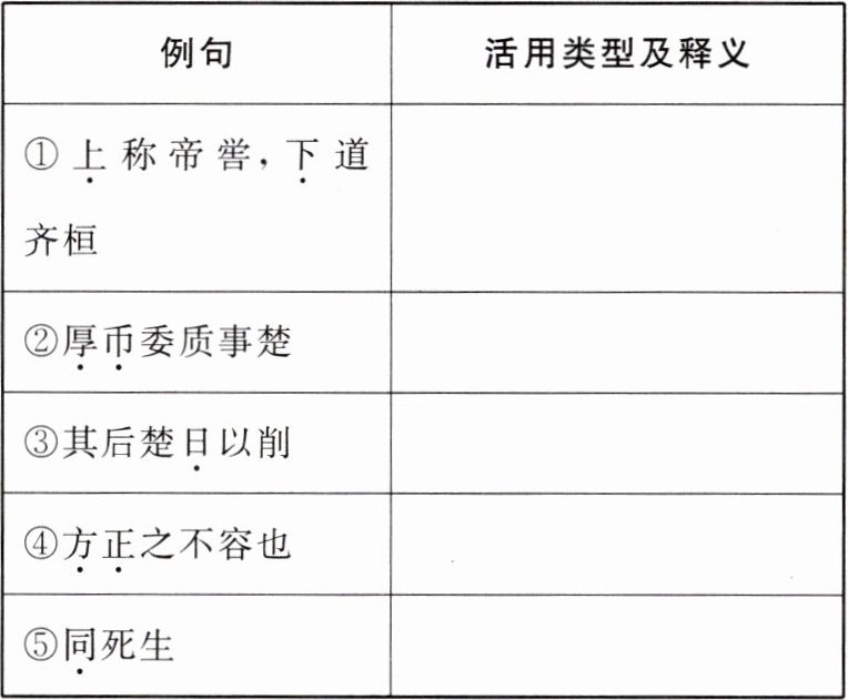 3.①名词作状语,往远处,往近处 ②名词作状语,拿着丰厚的礼物 ③名词作状语,一天天地 ④形容词作名词,端方正直的人 ⑤意动用法,以……为相同,同等看待