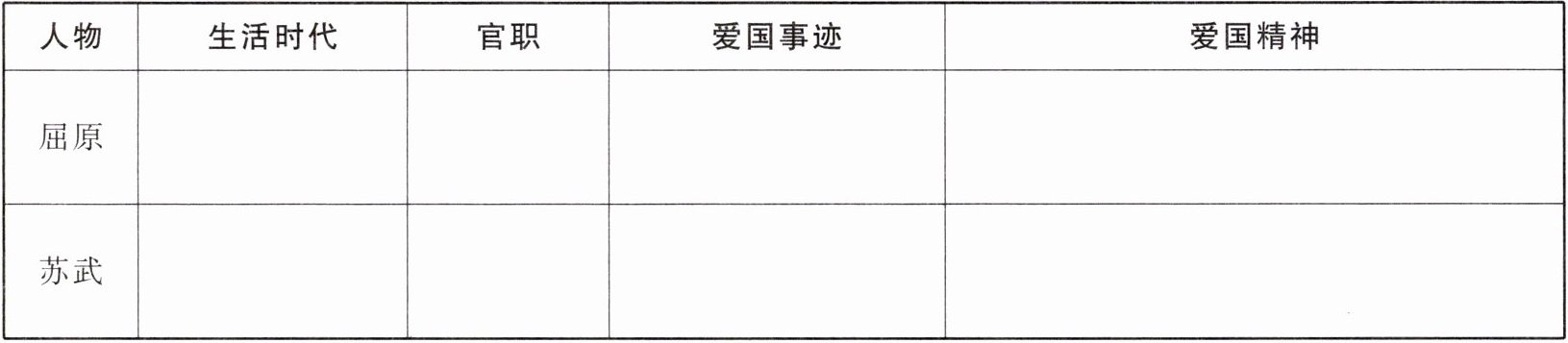 1. 屈原与苏武都是中国历史上伟大的爱国者,请写出他们的生活时代和官职,并概括出他们的爱国事迹和爱国精神,填写下表。