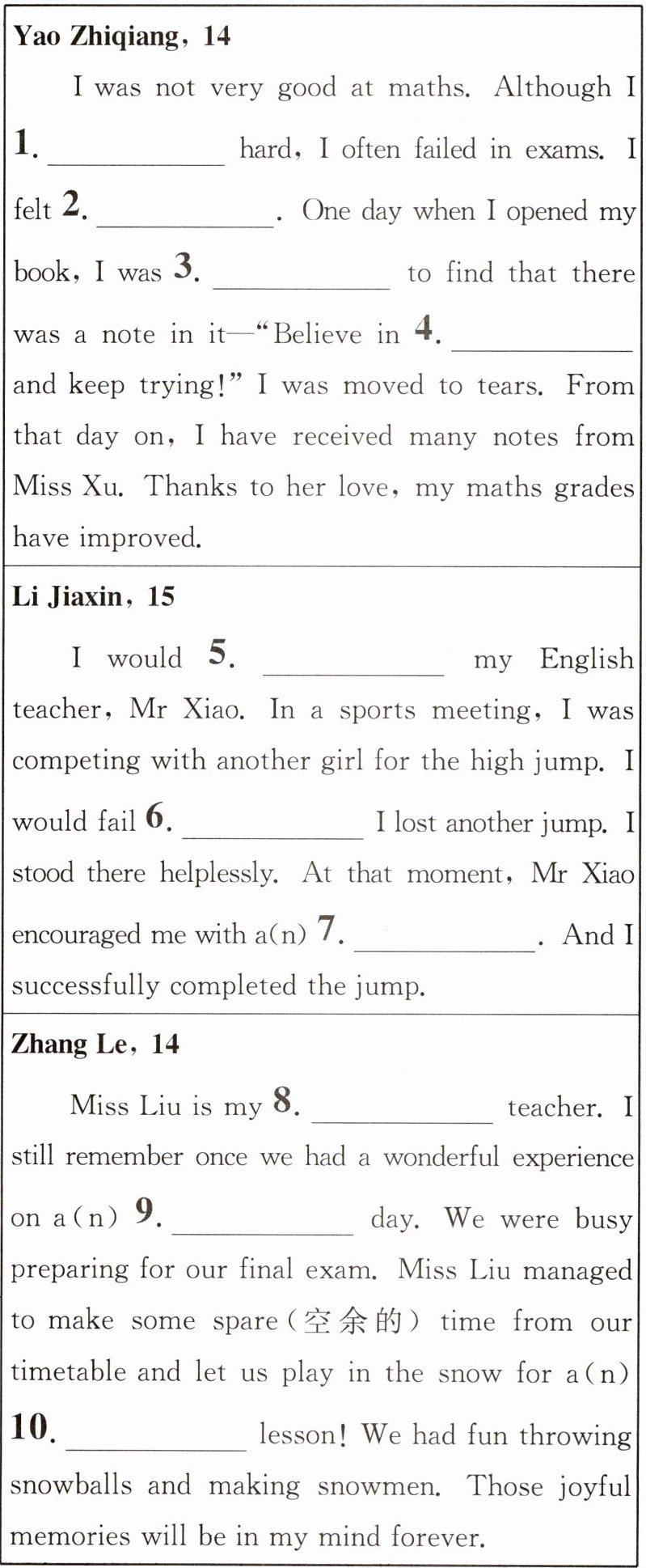 1.studied 2.sad 3.surprised 4.yourself 5.describe 6.if 7.smile 8.Chinese 9.snowy 10.whole
