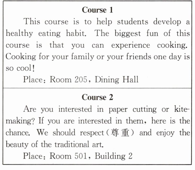 )1.If you want to experience cooking, where can you take the labour course?A. In Room 205, Dining Hall.