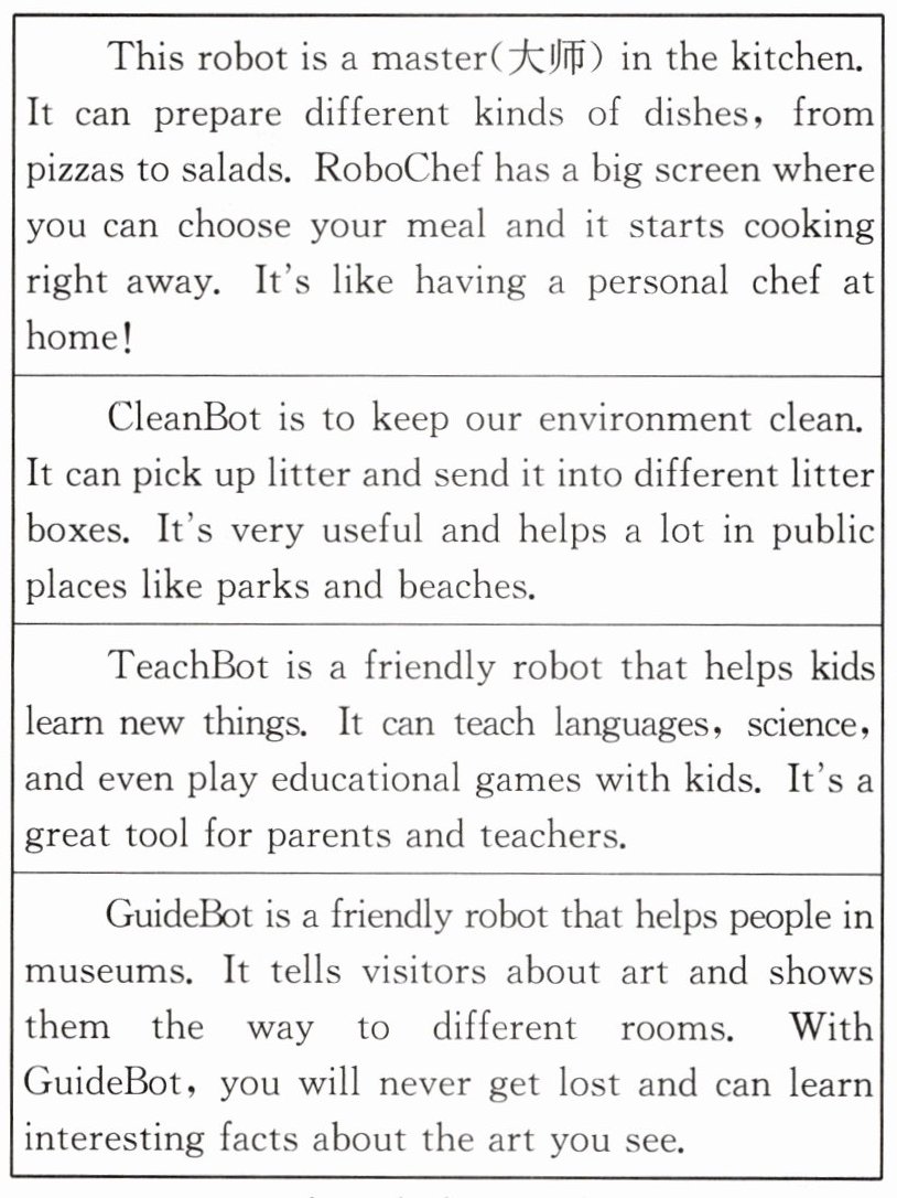 )4.What does GuideBot do in museums?A.It protects the artworks.