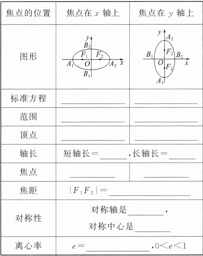 $\frac{x^2}{a^2}+\frac{y^2}{b^2}=1(a>b>0)$ $\frac{y^2}{a^2}+\frac{x^2}{b^2}=1(a>b>0)$ $-a\leq x\leq a$,$-b\leq y\leq b$ $-b\leq x\leq b$,$-a\leq y\leq a$ $A_1(-a,0),A_2(a,0)$,$B_1(0,-b),B_2(0,b)$ $A_1(0,-a),A_2(0,a)$,$B_1(-b,0),B_2(b,0)$ $2b$ $2a$ $F_1(-c,0),F_2(c,0)$ $F_1(0,-c),F_2(0,c)$ $2c=2\sqrt{a^2-b^2}$ 坐标轴 原点 $\frac{c}{a}$