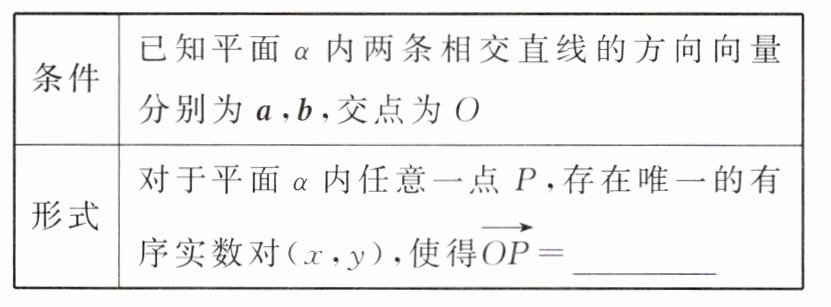 (1)通过平面 $ \alpha $ 内的一个定点 $ O $ 和两个向量 $ \boldsymbol{a} $ 和 $ \boldsymbol{b} $ 来确定: