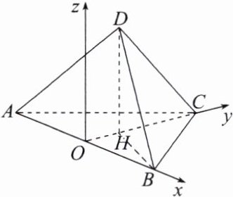 2. 如图,放置于空间直角坐标系中的棱长为 $ 2 $ 的正四面体 $ ABCD $ 中,$ H $ 是底面的中心,$ DH \perp $ 平面 $ ABC $,则平面 $ BHD $ 的一个法向量是 ______.