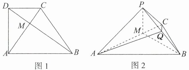 例3 如图1,已知直角梯形 $ ABCD $ 中,$ \angle ADC = 90^{\circ} $,$ AB // CD $,$ AB = 2CD = \sqrt{6} $,$ AD = \sqrt{3} $,$ M $ 为对角线 $ AC $ 与 $ BD $ 的交点. 现以 $ AC $ 为折痕把 $ \triangle ADC $ 折起,使点 $ D $ 到达点 $ P $ 的位置,得到三棱锥 $ P - ABC $,点 $ Q $ 为 $ PB $ 的中点,如图2所示.