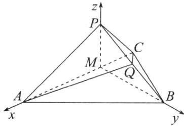 又因为$AC\perp BM$,$MA$,$MB$,$MP$两两垂直。故以$M$为原点,$MA$,$MB$,$MP$所在直线分别为$x$轴、$y$轴、$z$轴,建立如图所示的空间直角坐标系。