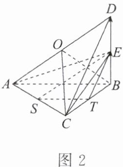 (2) 延长$AO$与球$O$交于点$D$,抽象出立体图形如图2,若$\triangle ABC$为直角三角形,$AC\perp BC$,直线$DA$,$DC$与平面$ABC$所成的角分别为$\frac{\pi}{4}$,$\frac{\pi}{3}$,$\overrightarrow{BE}=\lambda\overrightarrow{BD}$,$\lambda\in(0,1$,$S$为$AC$的中点,$T$为$BC$的中点.