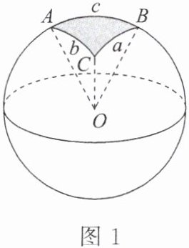 如图1,球$O$的半径为$R$,$A$,$B$,$C$为球面上三点,曲面三角形$ABC$(阴影部分)叫做球面三角形.设$O_{a}$表示以$O$为圆心,且过$B$,$C$的圆,圆$O_{a}$的劣弧$BC$的长记为$a$,同理,圆$O_{b}$,$O_{c}$的劣弧$AC$,$AB$的长分别记为$b$,$c$.若设二面角$C - OA - B$,$A - OB - C$,$B - OC - A$分别为$\alpha$,$\beta$,$\gamma$,则球面三角形$ABC$的面积为$S_{球面\triangle ABC}=(\alpha+\beta+\gamma-\pi)R^{2}$.