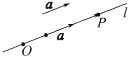 (2)如图,$O$ 是直线 $l$ 上一点,在直线 $l$ 上取非零向量 $a$,则对于直线 $l$ 上任意一点 $P$,由数乘向量的定义及向量共线的充要条件可知,存在实数 $\lambda$,使得 $\overrightarrow{OP} =$______. 我们把与向量 $a$ 平行的非零向量称为直线 $l$ 的______. 这样,直线 $l$ 上任意一点都可以由直线 $l$ 上的一点和它的______表示,也就是说,直线可以由其上一点和它的______确定.