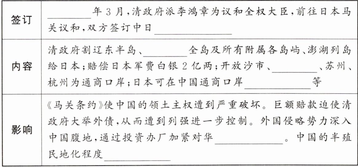 (4)北洋舰队 4.1895 《马关条约》 台湾 重庆 开设工厂 资本输出 大大加深