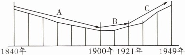7. 图表分析 《近代中国历史进程概说》中写道:“近代中国社会的发展轨迹像个元宝形,开始是下降,降到谷底,然后上升,升出一片光明……”发展轨迹如下图。图中A段下降的主要原因是(
