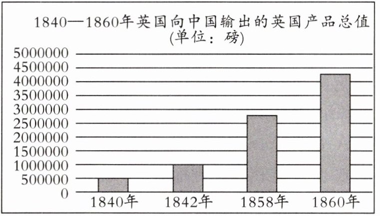 (2)[数据分析]根据材料二,概括1840—1860年,英国向中国输出的产品总值的发展趋势并分析出现这种趋势的原因。