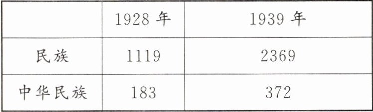 6. 下表内容是近代报纸《申报》在1928年和1939年使用“民族”“中华民族”两词的次数,导致这一变化的时代背景是 (