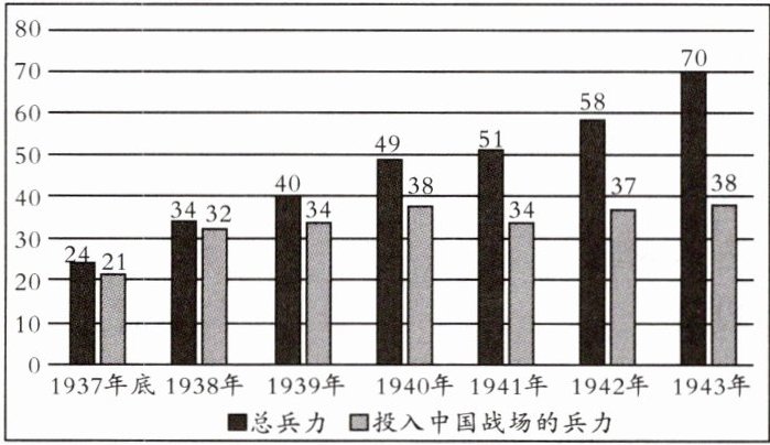 2. 图表分析 下图是日本陆军总兵力以及投入中国战场兵力的统计表(单位:个师团)。数据表明(