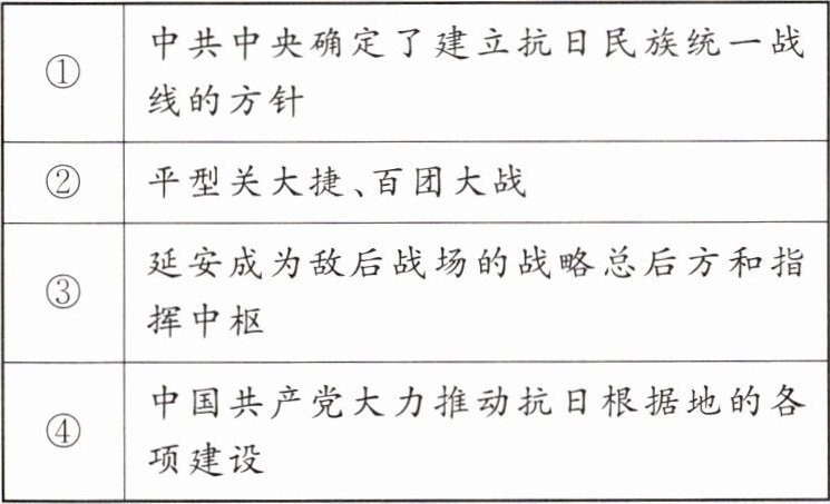 6.D 【解析】根据题干信息和所学知识可知,①②反映了中国共产党是全民族抗战和抗日民族统一战线的倡导者、组织者和推动者,③④反映了中国共产党在抗日根据地施行的各项建设为抗战胜利奠定了坚实基础。抗日战争的实践表明,中国共产党在全民族抗战中发挥了中流砥柱作用,是中国人民抗日战争取得完全胜利的决定性因素。D项正确。