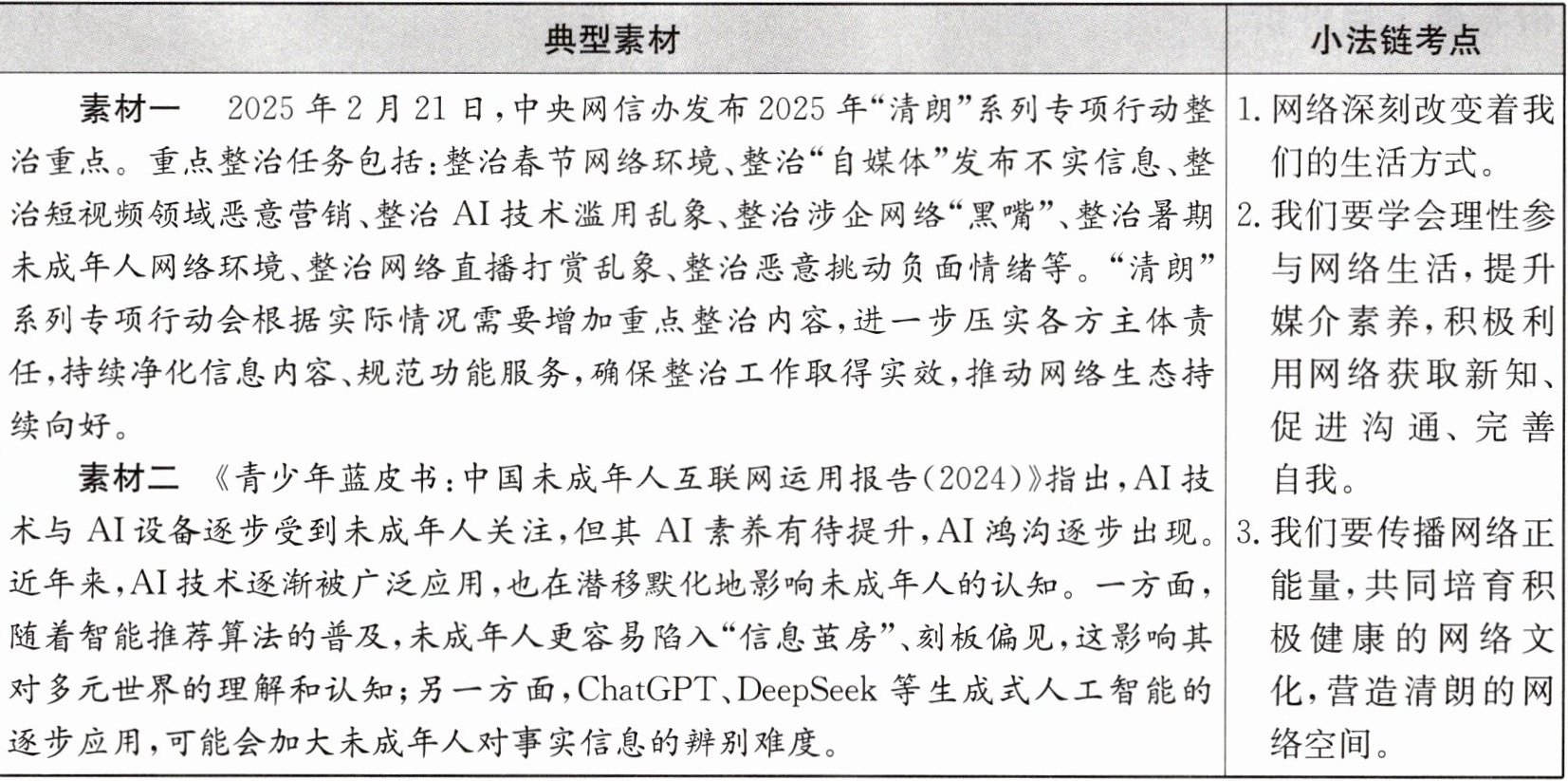 (2)做法类 运用所学知识,请你谈谈如何“多方联动”为未成年人营造清朗的网络空间。