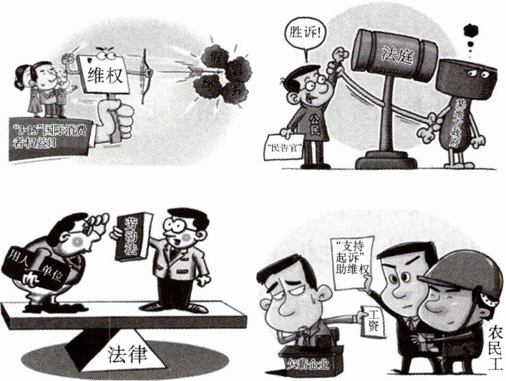 【课外拓展提升】 2.D 【解析】本题考查依法办事。上述漫画中,消费者依法维权、“民告官”、农民工依法讨要工资等,都体现了依法办事、依法维权,D符合题意;A、B、C没有准确概括上述漫画的主旨。故选D。