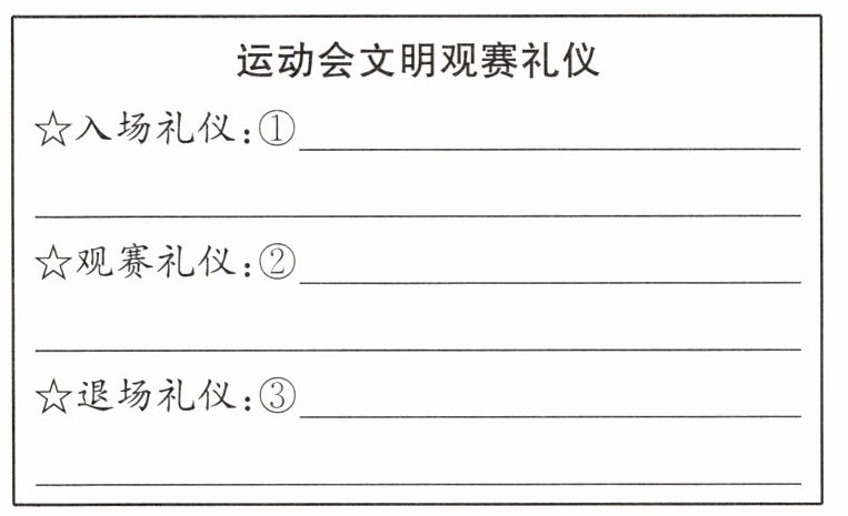 (3)创新设问·文明观赛礼仪 近年来,随着体育强国建设的推进,我国观众的文明观赛等体育文明礼仪显著提升。请你完善下面的运动会文明观赛礼仪。
