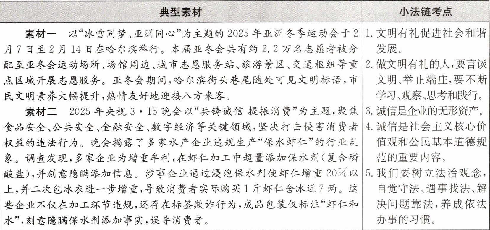 (4)①诚信:企业在虾仁加工中超量添加保水剂等行为欺骗消费者,违背诚信原则,损害市场秩序,不利于消费市场的健康发展。②法治:涉事企业违反食品安全法律法规,侵犯消费者的合法权益,不符合法治的要求。