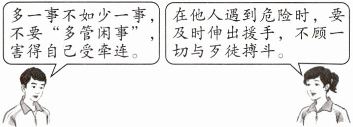 6.男同学的观点不正确。(1分)面对非正义行为,我们要敢于斗争,相信正义必定战胜邪恶。同非正义行为作斗争不仅仅是成年人的事,也是包括我们青少年在内的全体公民的责任。(2分)对他人出手相助不是多管闲事,不能因为害怕自己受牵连而袖手旁观,但同时我们要注意做到见义智为。(2分)